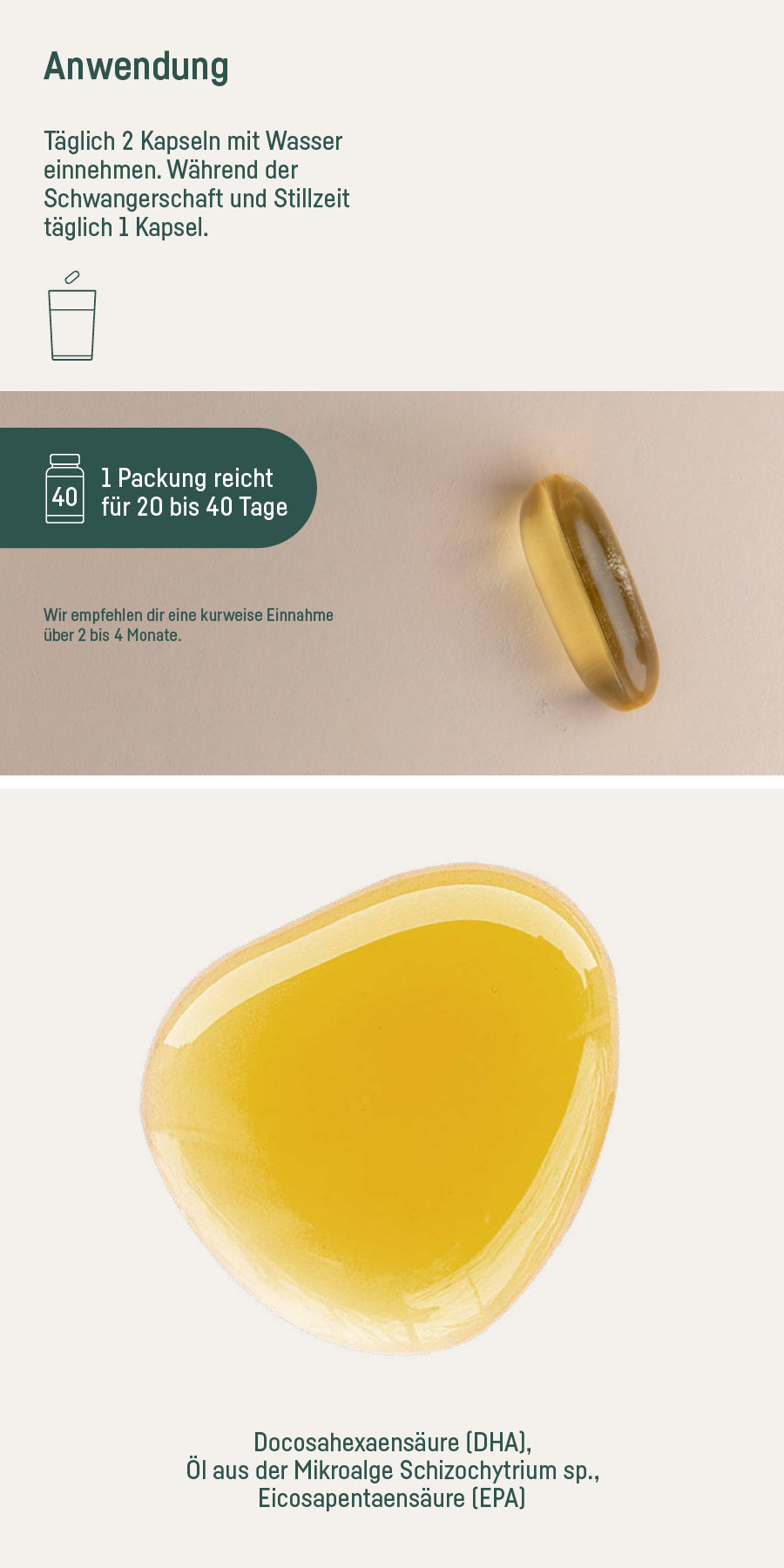 Eine Packung Supplement Omega 3 vegan reicht für 20-40 Tage.