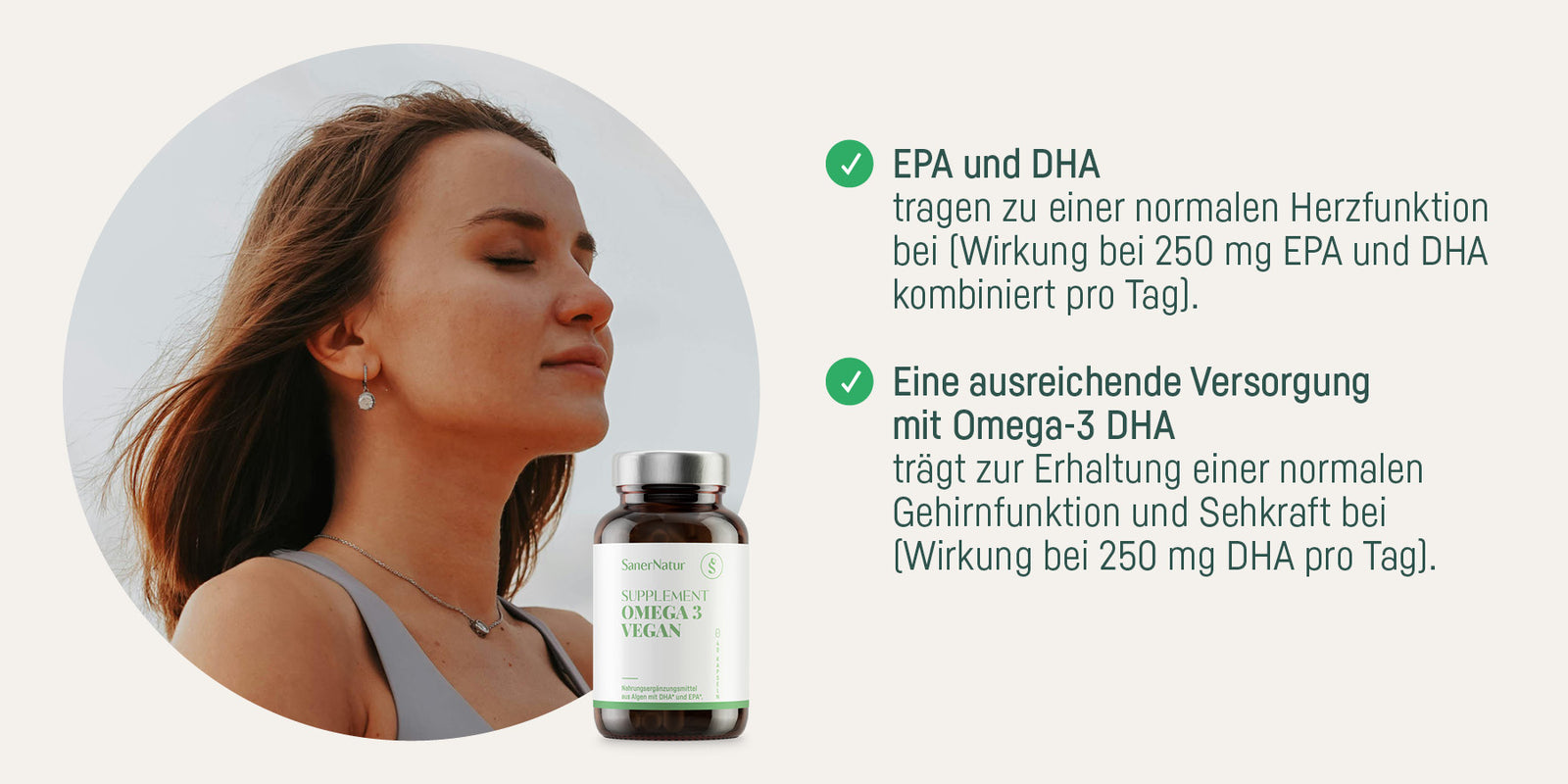 DHA und EPA tragen zu einer normalen Herzfunktion (Wirkung bei 250 mg EPA und DHA kombiniert pro Tag) und der Erhaltung einer normalen Gehirnfunktion und Sehkraft (Wirkung bei 250 mg DHA pro Tag) bei.
