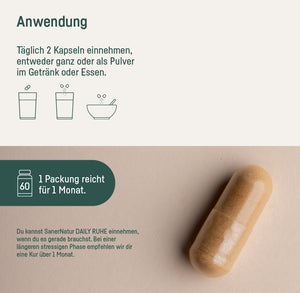 Auch deine Nerven und deine Psyche sind auf Mikronährstoffe angewiesen, um ihre Funktion vollumfänglich zu erfüllen – und dazu gehören auch Ruhe und Entspannung, um nicht ständig unter Strom zu stehen, deine Energiereserven wieder aufzufüllen und neue Kraft für die nächste Herausforderung zu sammeln. SanerNatur DAILY RUHE enthält verschiedene Vitamine des B-Komplexes, um das zu unterstützen.