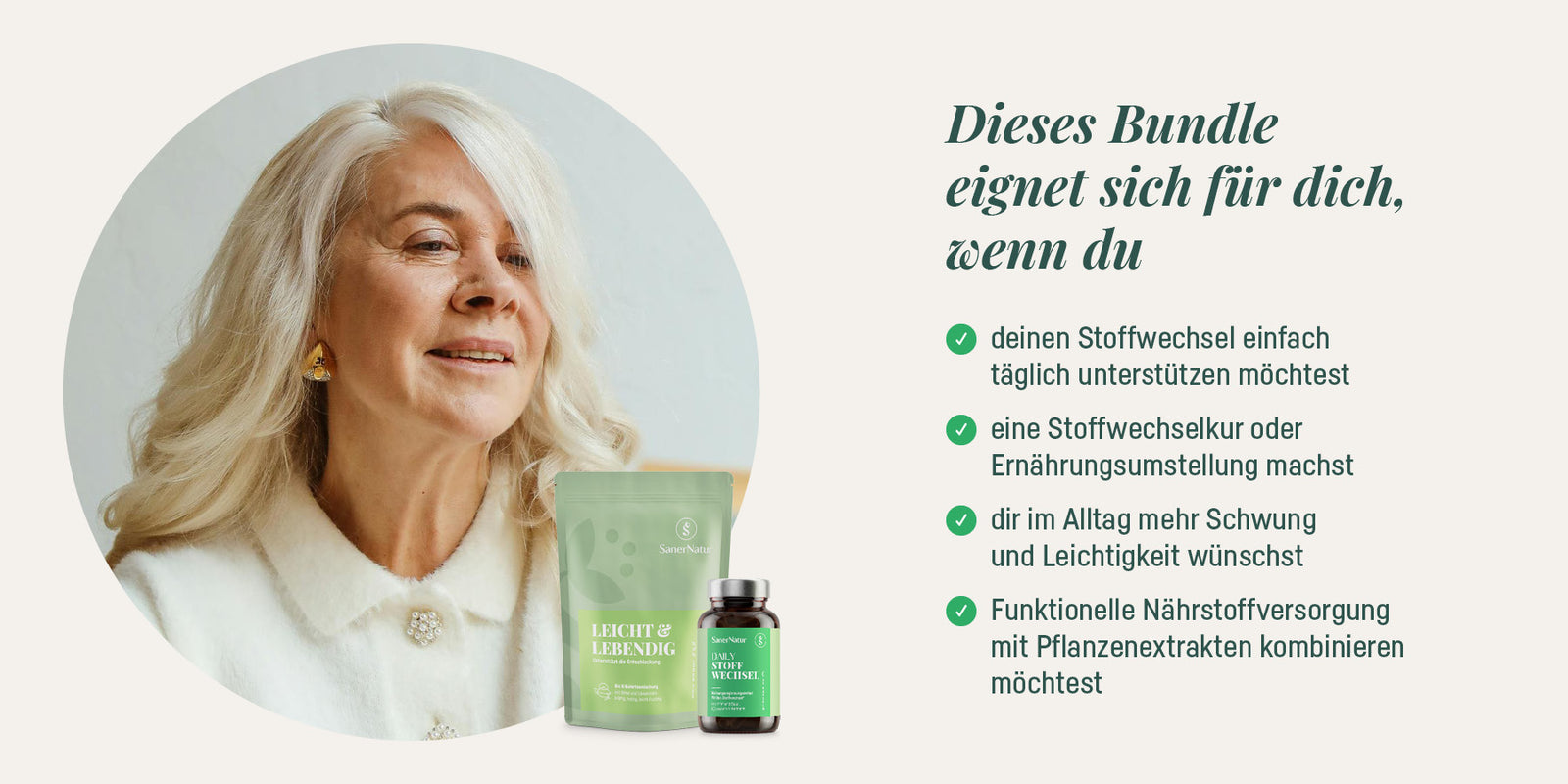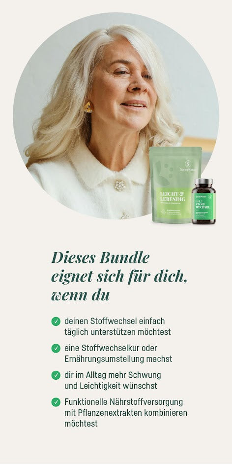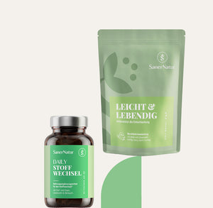 Unser Stoffwechsel-Bundle unterstützt dich mit zwei ideal aufeinander abgestimmten Produkten. Gemeinsam bringen sie deinen Stoffwechsel in Bewegung und helfen dir, dich von Altlasten zu verabschieden. Geeignet zur unkomplizierten Unterstützung im Alltag oder als gezielte Begleitung zu Stoffwechselkuren, Entschlackung und Detox. Mach’s deinem Stoffwechsel leichter!