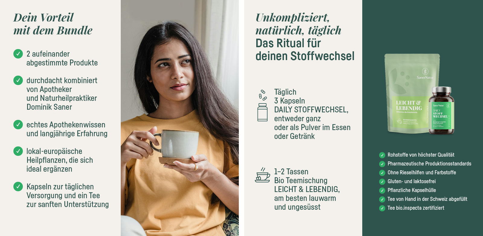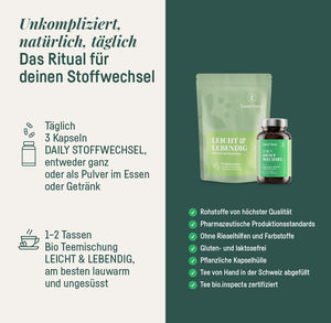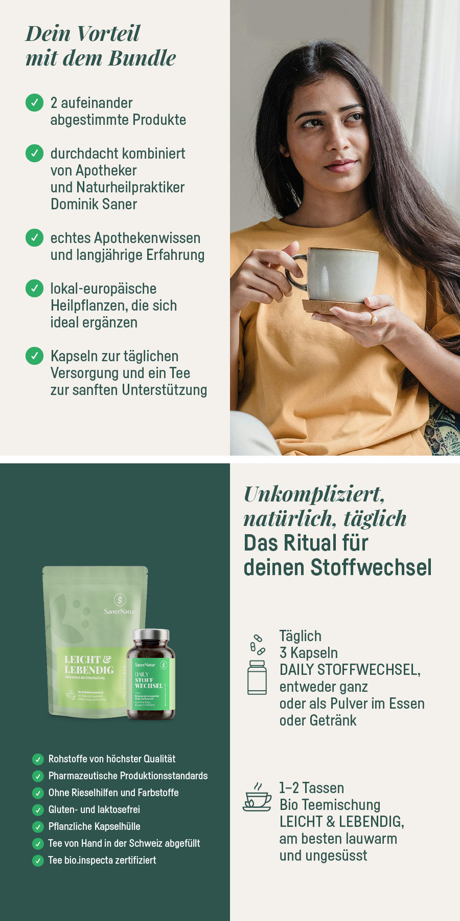 Natürliche Unterstützung für deinen Stoffwechsel mit den Daily Stoffwechsel Kapseln und der Bio Teemischung leicht & lebendig – ideal aufeinander abgestimmt von Apotheker und Naturheilpraktiker Dominik Saner.