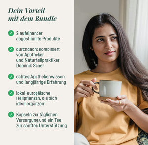 Unsere Produkt-Bundles werden von Apotheker und Naturheilpraktiker Dominik Saner sorgfältig und mit langjähriger Erfahrung zusammengestellt. Die Produkte sind in Dosierung und Zusammensetzung so aufeinander abgestimmt, dass sie sich funktionell ergänzen. Das gibt dir die Sicherheit, dass du ganzheitlich, gezielt und bedarfsspezifisch versorgt bist, ohne dir den Kopf darüber zerbrechen zu müssen.