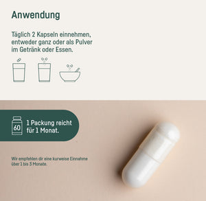 Täglich 2 Kapseln mit Wasser einnehmen, entweder ganz schlucken oder geöffnet als Pulver im Getränk oder Essen beigeben.