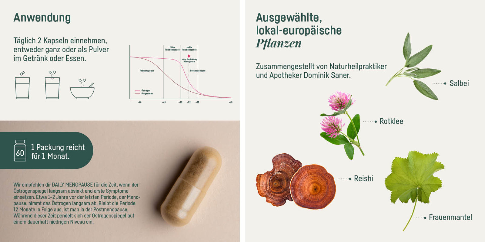 Extrakte von Rotklee, Frauenmantel, Salbei und dem Vitalpilz Reishi ergänzen die Vitamine. Pflanzen, die auf unserem Kontinent, wenn nicht sogar in deinem Garten heimisch sind. Sie haben in der europäischen Naturheilkunde lange Tradition.