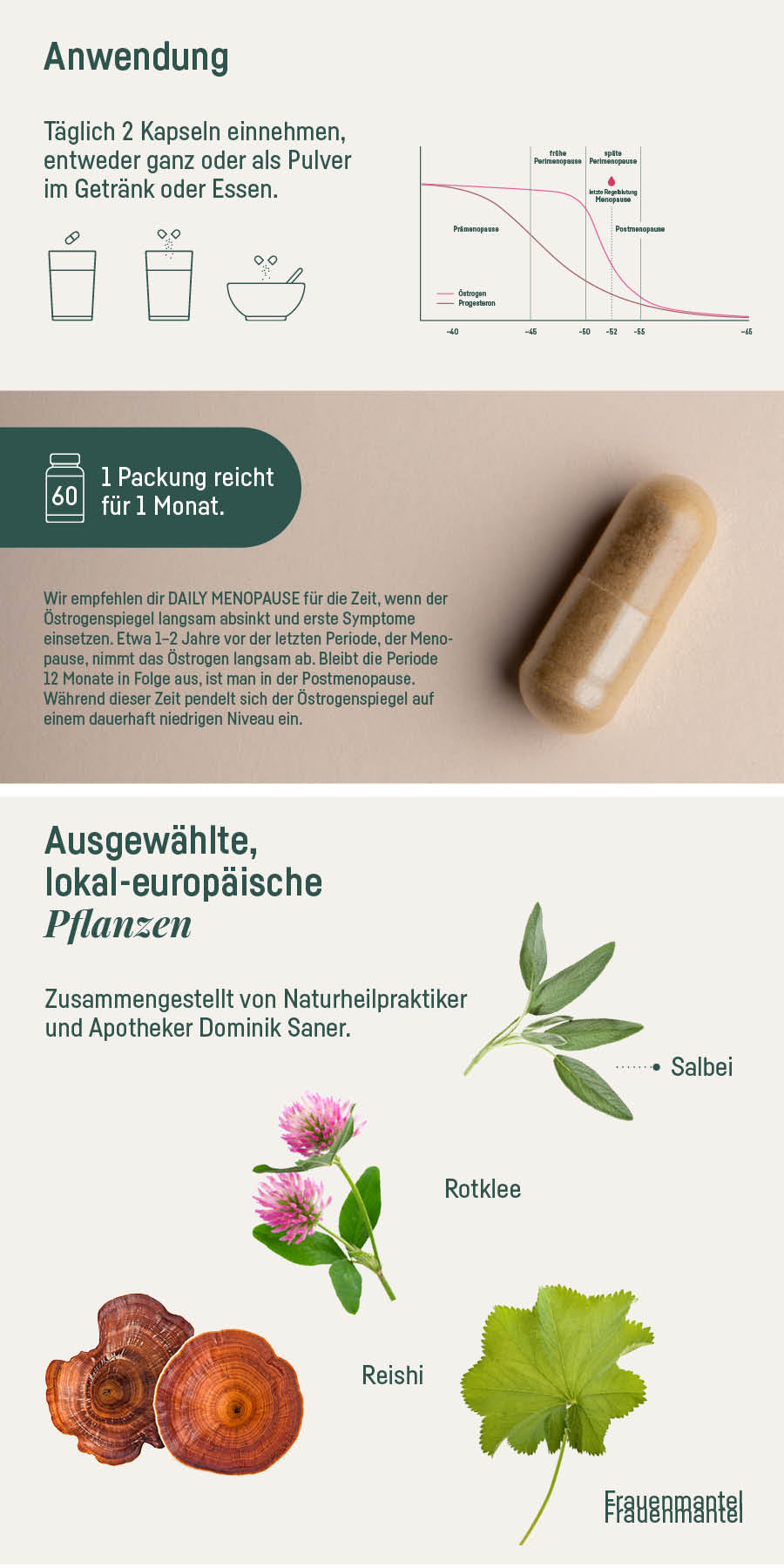 Wir empfehlen dir, SanerNatur DAILY MENOPAUSE als Kur während 3-6 Monaten einzunehmen und anschliessend eine Pause zu machen. Bei Nahrungsergänzungsmitteln mit Pflanzenextrakten ist es sinnvoll, hin und wieder eine Pause einzulegen, um zu beobachten, wie dein Körper ohne das Produkt reagiert.