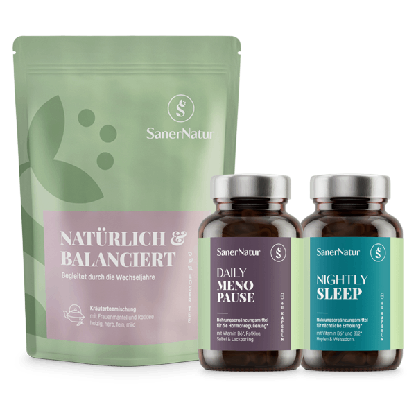 Du kannst SanerNatur DAILY MENOPAUSE mit anderen SanerNatur-Produkten kombinieren. Aus unserem Erfahrungswissen haben wir spannende Produkt-Bundles zusammengestellt. So kannst du SanerNatur DAILY MENOPAUSE gut mit SanerNatur NIGHTLY SLEEP und der Teemischung NATÜRLICH & BALANCIERT kombinieren.