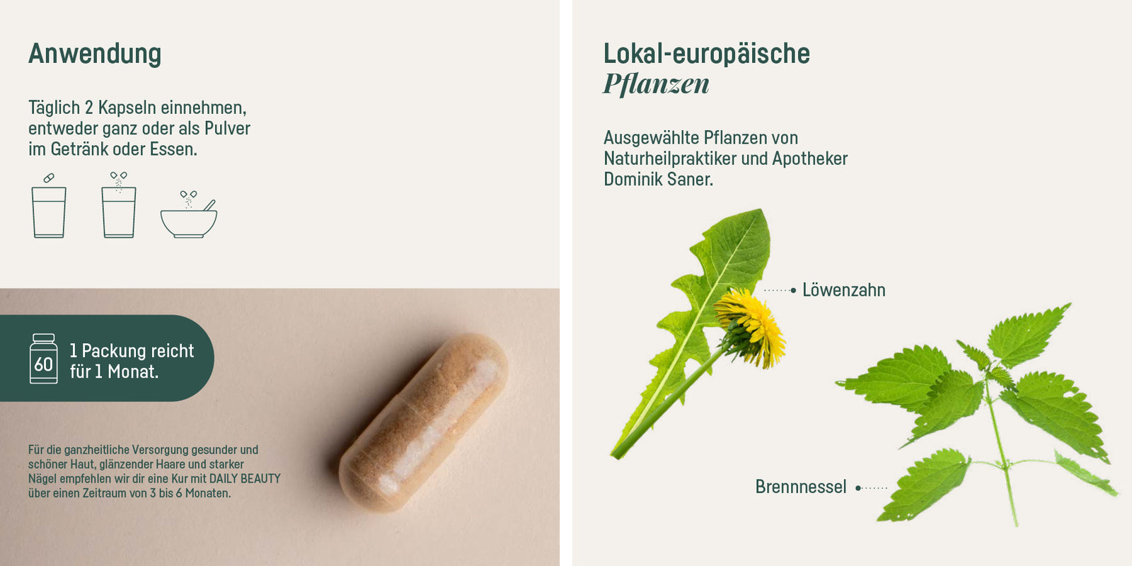 Extrakte von Hirse, Löwenzahn und Brennnessel sowie Kieselerde ergänzen die Mikronährstoffe. Pflanzen und natürliche Stoffe, die in Europa, wenn nicht sogar in deinem Garten heimisch sind. In der europäischen Naturheilkunde und Erfahrungsmedizin haben sie lange Tradition.