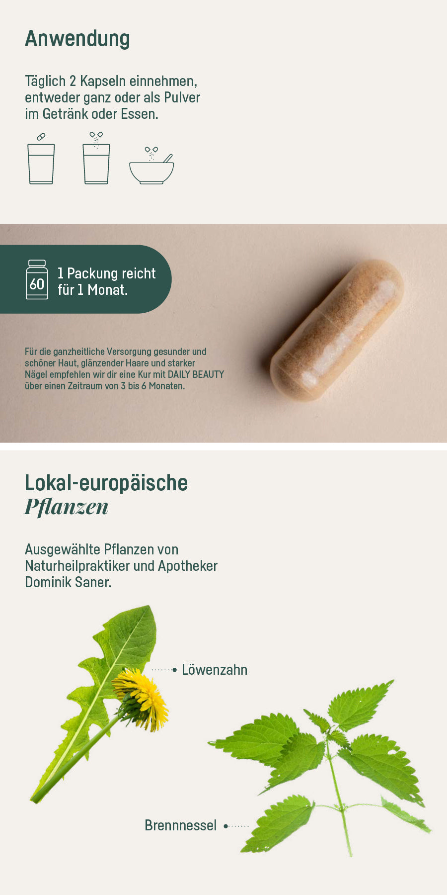 Für die ganzheitliche Versorgung gesunder und schöner Haut, glänzender Haare und starker Nägel empfehlen wir dir eine Kur mit Daily Beauty über einen Zeitraum von 3 bis 6 Monaten.