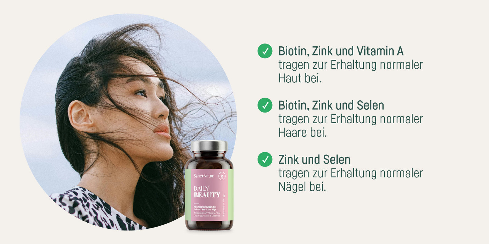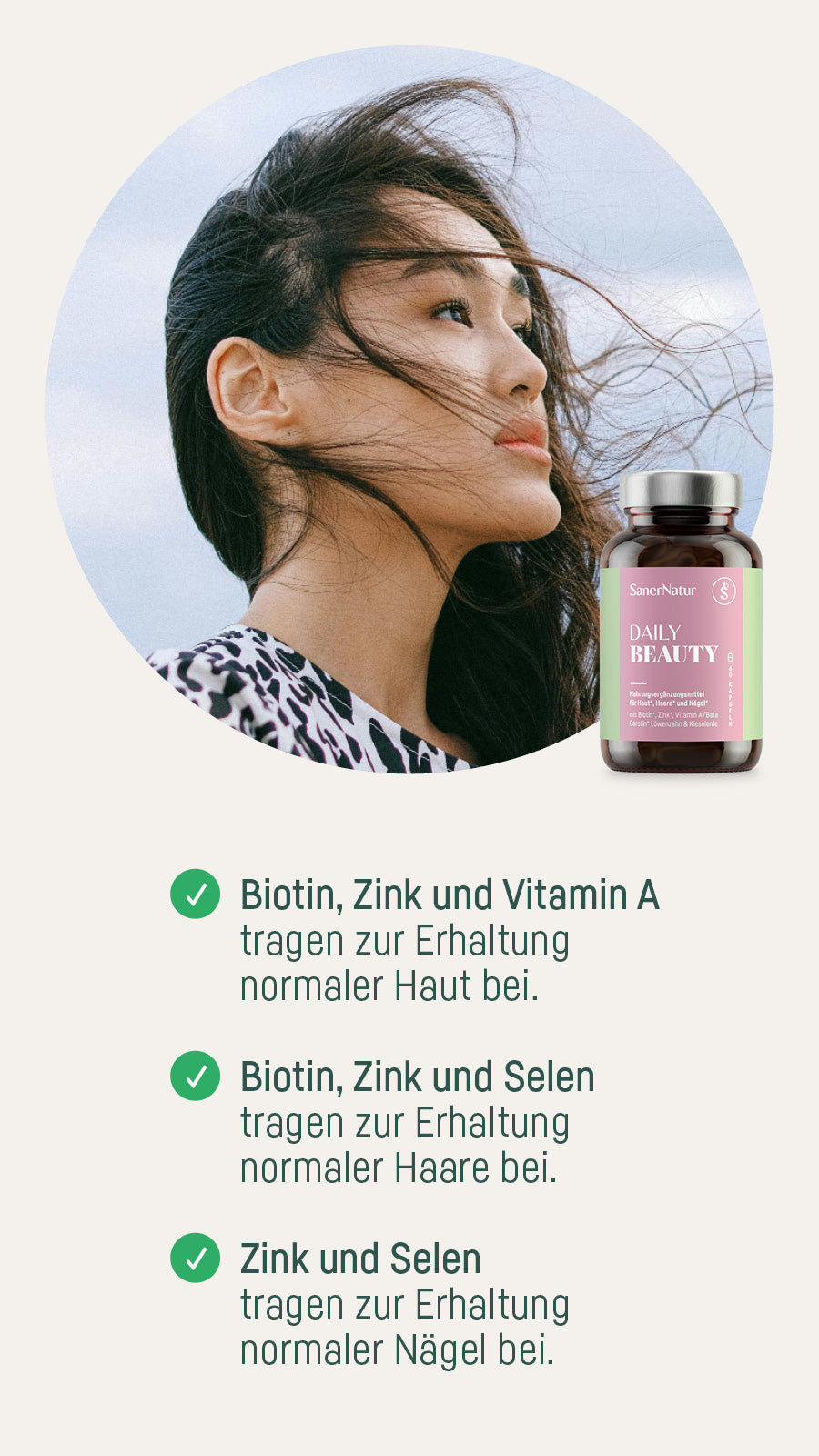 Mit Biotin, Zink und Vitamin A unterstützt SanerNatur DAILY BEAUTY die Bildung und Gesunderhaltung von Haut, Haaren und Nägeln.