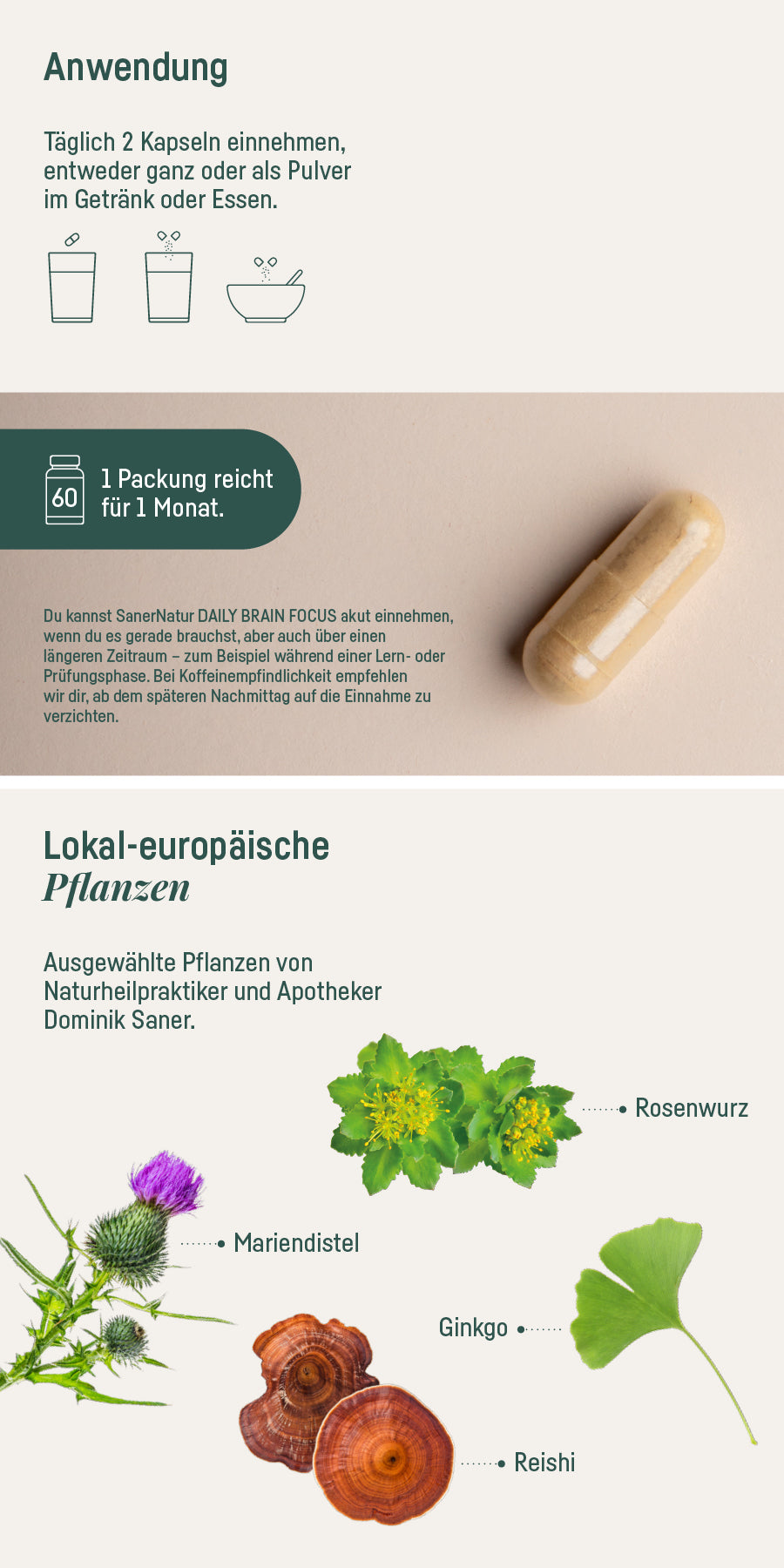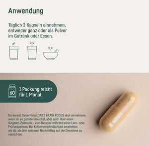 Du kannst SanerNatur DAILY BRAIN FOCUS akut einnehmen, wenn du es gerade brauchst, aber auch täglich über einen längeren Zeitraum – zum Beispiel während einer Lern- oder Prüfungsphase. Achte unbedingt darauf, dir nach solchen Phasen auch genügend Erholung zu gönnen, und pausiere dann entsprechend auch die Einnahme von DAILY BRAIN FOCUS.