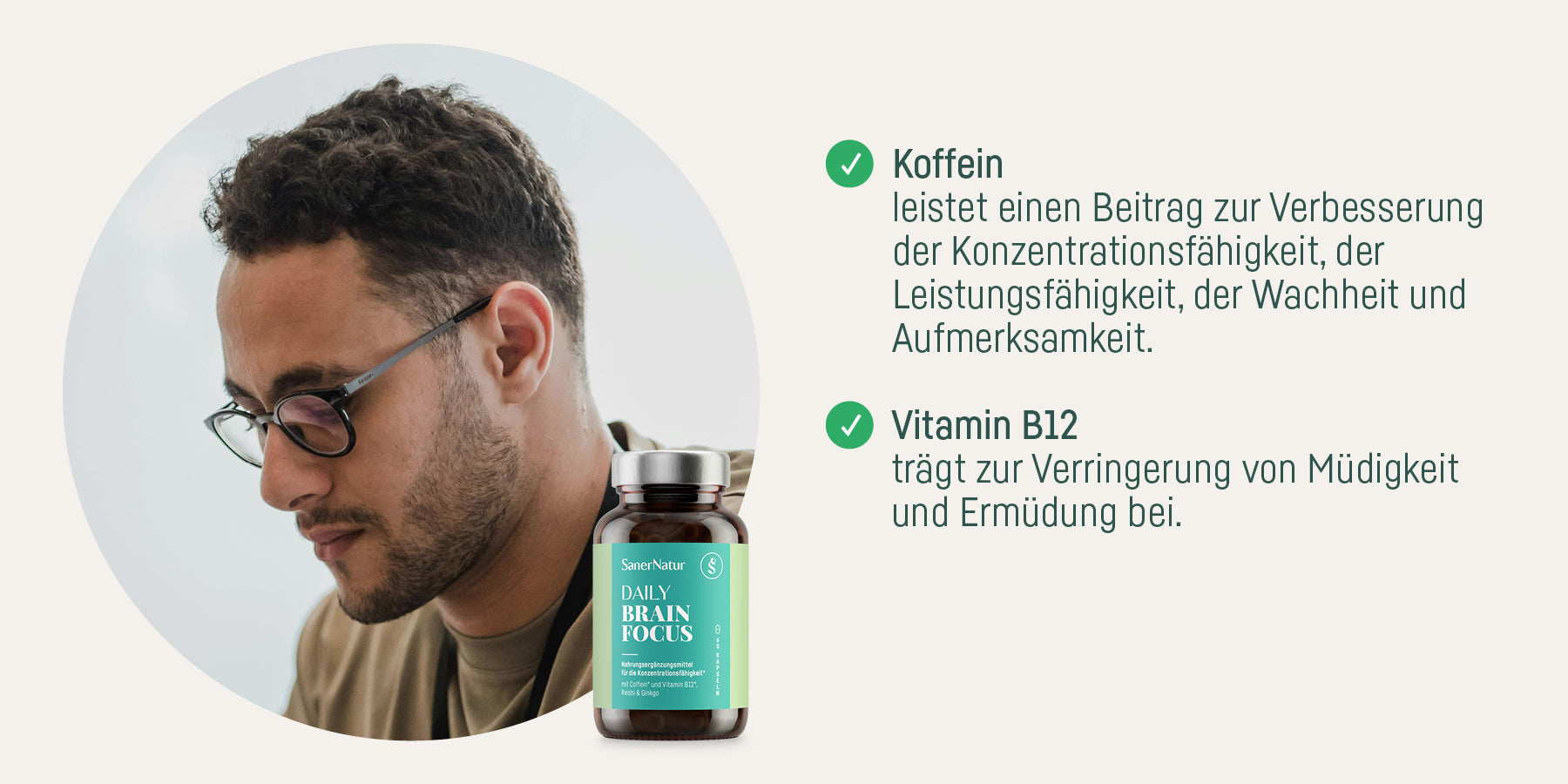 Mit Coffein und Vitamin B12 unterstützt SanerNatur DAILY BRAIN FOCUS Konzentration, Leistungsfähigkeit und Energiehaushalt.
