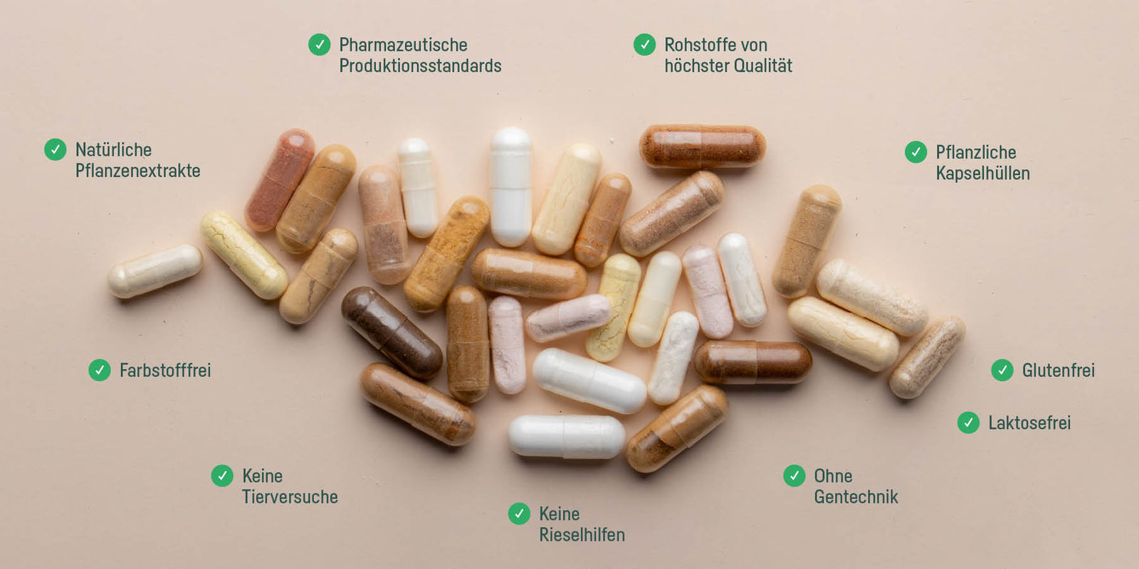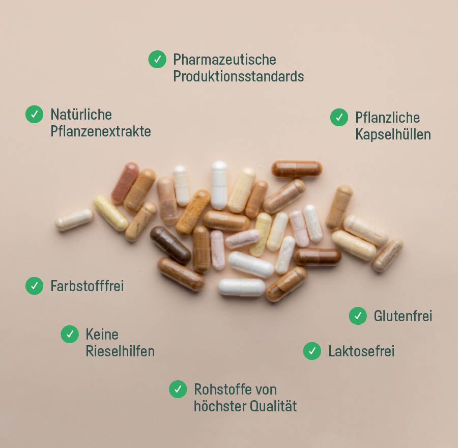 lactosefrei, glutenfrei, gelatinefrei, farbstofffrei, vegan, vegane Kapselhülle, ohne Gentechnik, keine Rieselhilfen