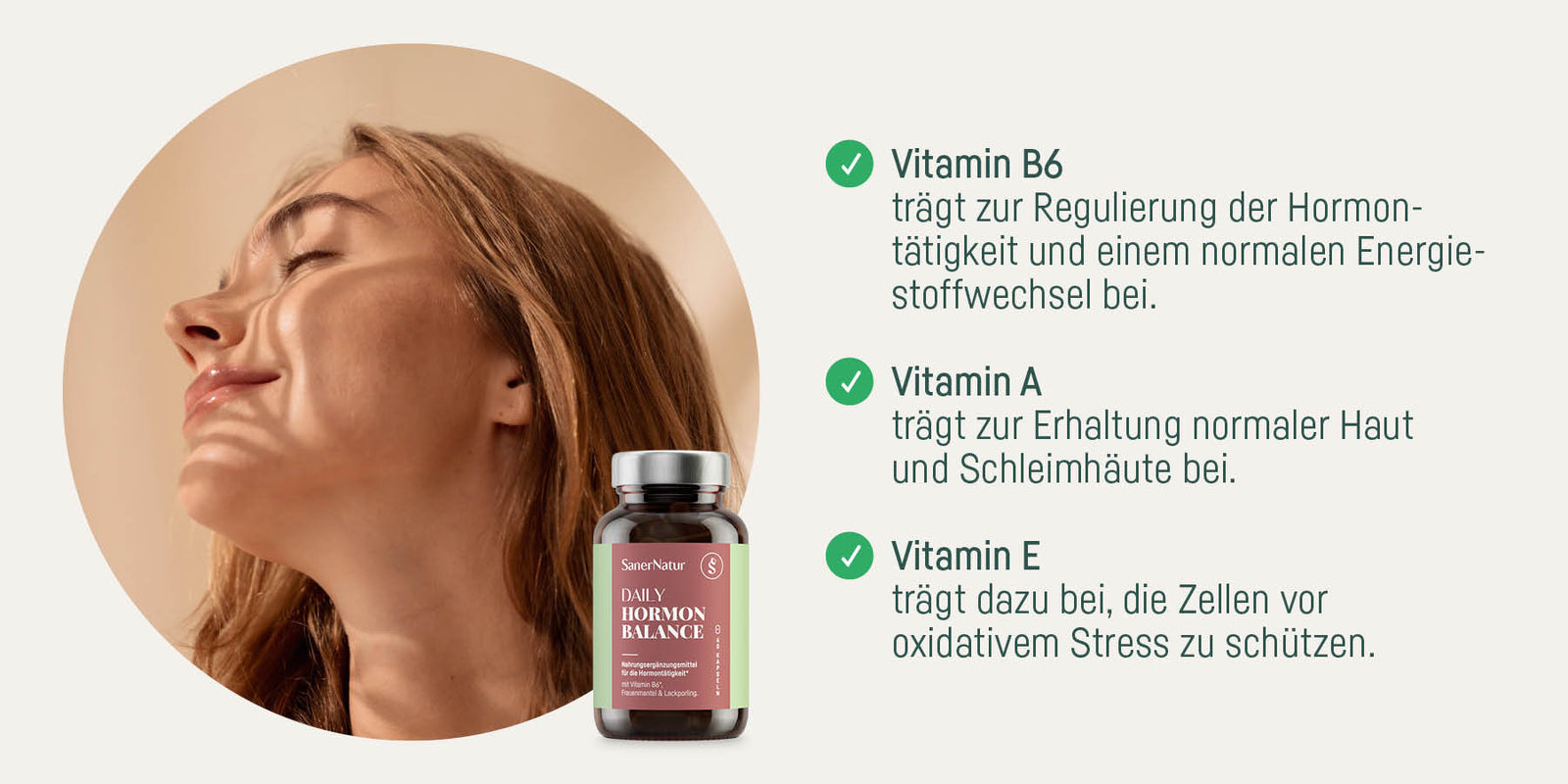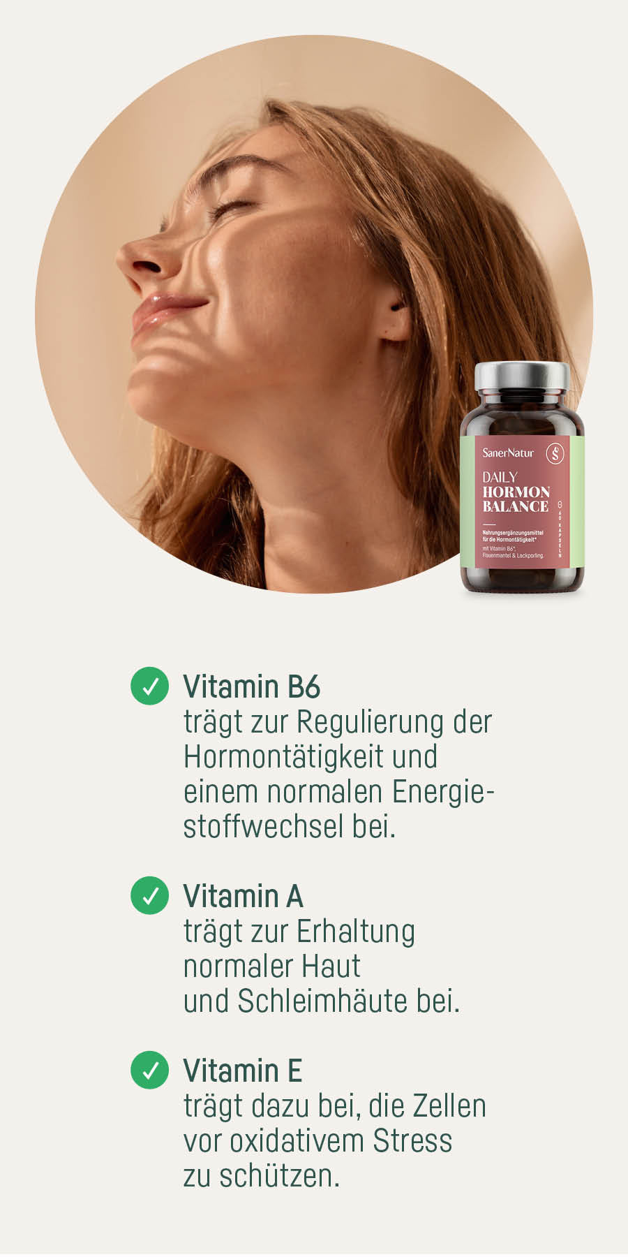 Mit Vitamin B6, A und E hilft SanerNatur DAILY HORMON BALANCE, deinen Hormonspiegel, deine Haut und deine Zellen natürlich zu regulieren.