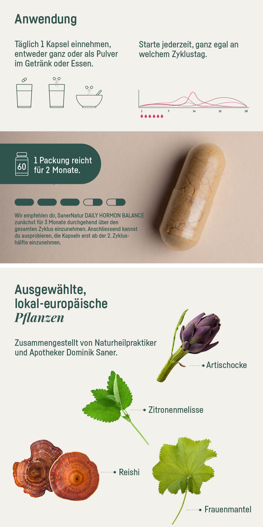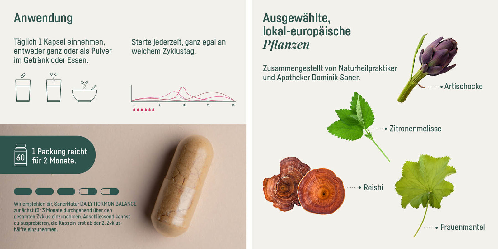 Wir empfehlen dir, SanerNatur DAILY Hormon Balance zunächst für 3 Monate durchgehend über den gesamten Zyklus einzunehmen. Anschliessend kannst du ausprobieren, die Kapseln erst ab der 2. Zyklushälfte einzunehmen.