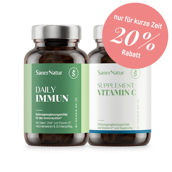 Ständig kommt unser Körper mit verschiedensten Erregern in Kontakt. Das Immunsystem hält sie in Schach und dich gesund. SanerNatur DAILY IMMUN enthält wichtige Mikronährstoffe, die deine Abwehr zum Funktionieren braucht, und kombiniert sie mit bewährten Pflanzenextrakten.