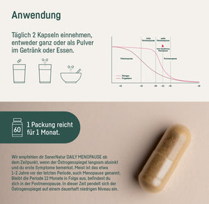 Wir empfehlen dir SanerNatur DAILY MENOPAUSE für die Zeit, wenn der Östrogenspiegel langsam absinkt und erste Symptome einsetzen. Etwa 1-2 Jahre vor der letzten Periode, der Menopause, nimmt das Östrogen langsam ab. Bleibt die Periode 12 Monate in Folge aus, ist man in der Postmenopause. Während dieser Zeit pendelt sich der Östrogenspiegel auf einem dauerhaft niedrigen Niveau ein.
