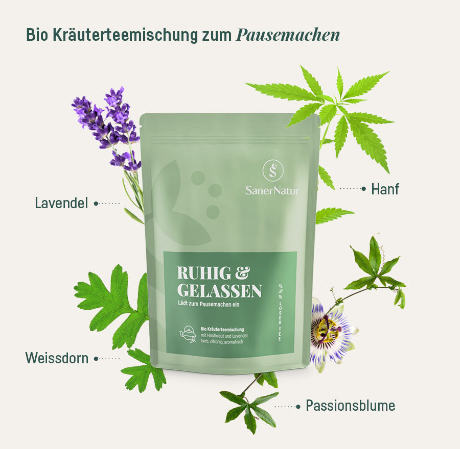 SanerNatur RUHIG & GELASSEN enthält wertvolle Teekräuter, die in der Naturheilkunde seit jeher einen festen Platz haben. Mit Hanfkraut, Lavendel, Passionsblumenkraut und Weissdornblättern und -Blüten lässt dich SanerNatur RUHIG & GELASSEN einen Moment der Entspannung geniessen.