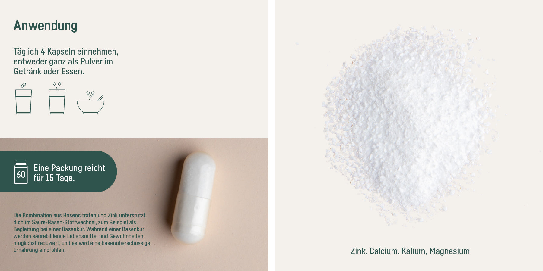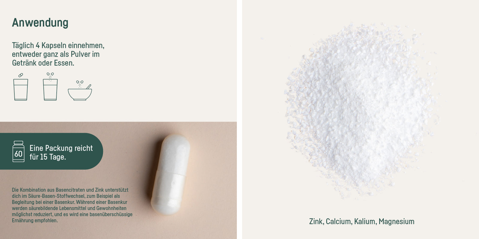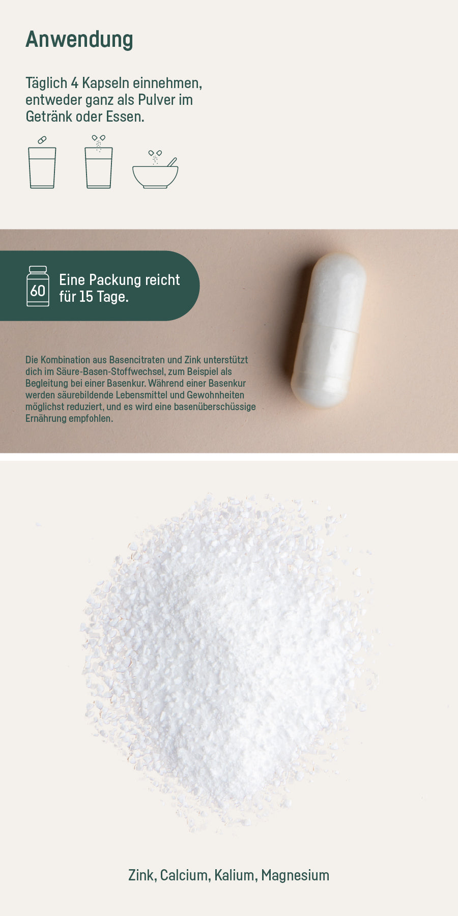 Möchtest du unseren Basen Mix nicht als Kapsel einnehmen, sondern das Pulver direkt ins Wasser, deinen Tee, Saft oder Smoothie geben, empfehlen wir dir unser offenes SUPPLEMENT BASEN MIX PULVER.