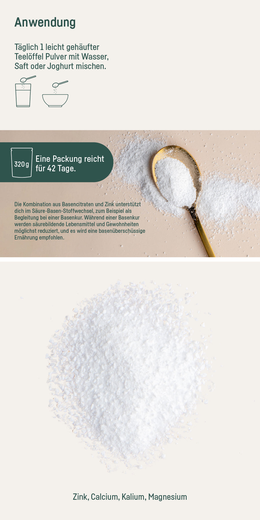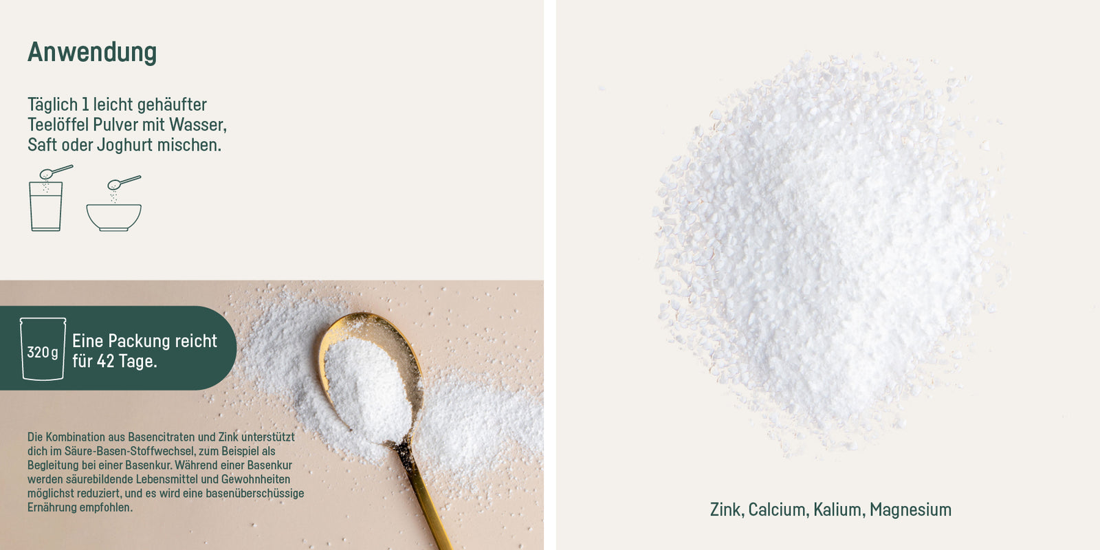 Die Kombination aus Basencitraten und Zink unterstützt dich im Säure-Basen-Stoffwechsel, zum Beispiel als Begleitung bei einer Basenkur. Während einer Basenkur werden säurebildende Lebensmittel und Gewohnheiten möglichst reduziert, und es wird eine basenüberschüssige Ernährung empfohlen.