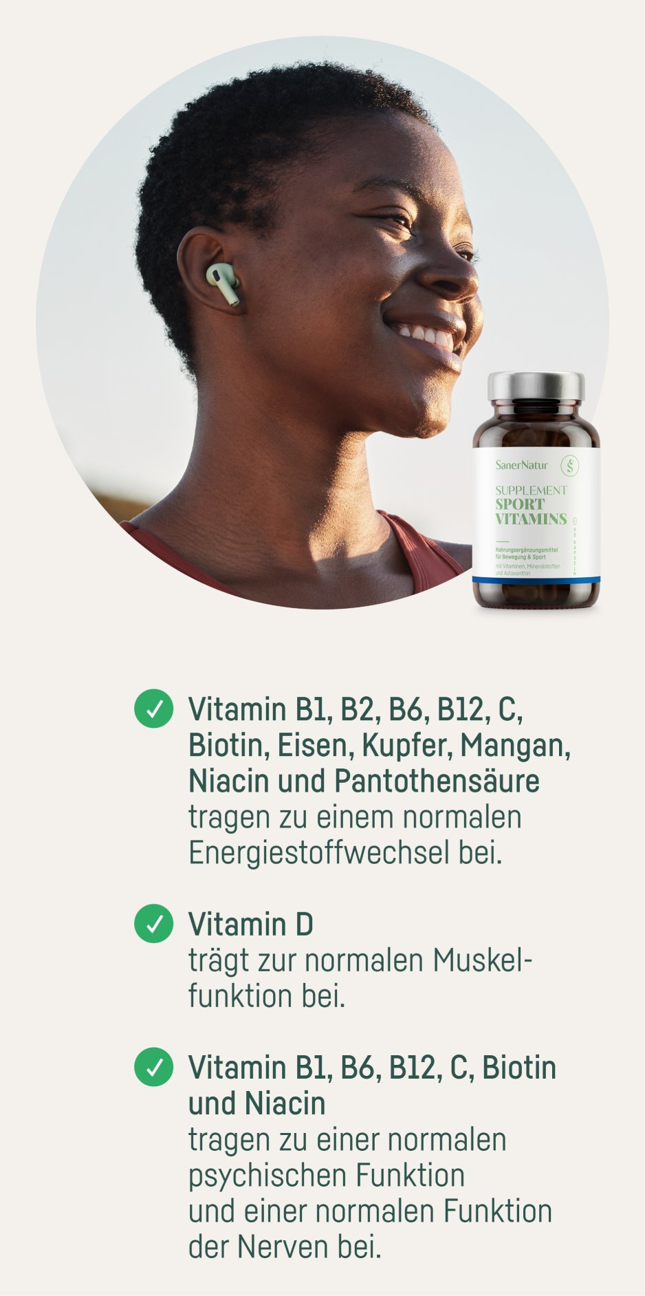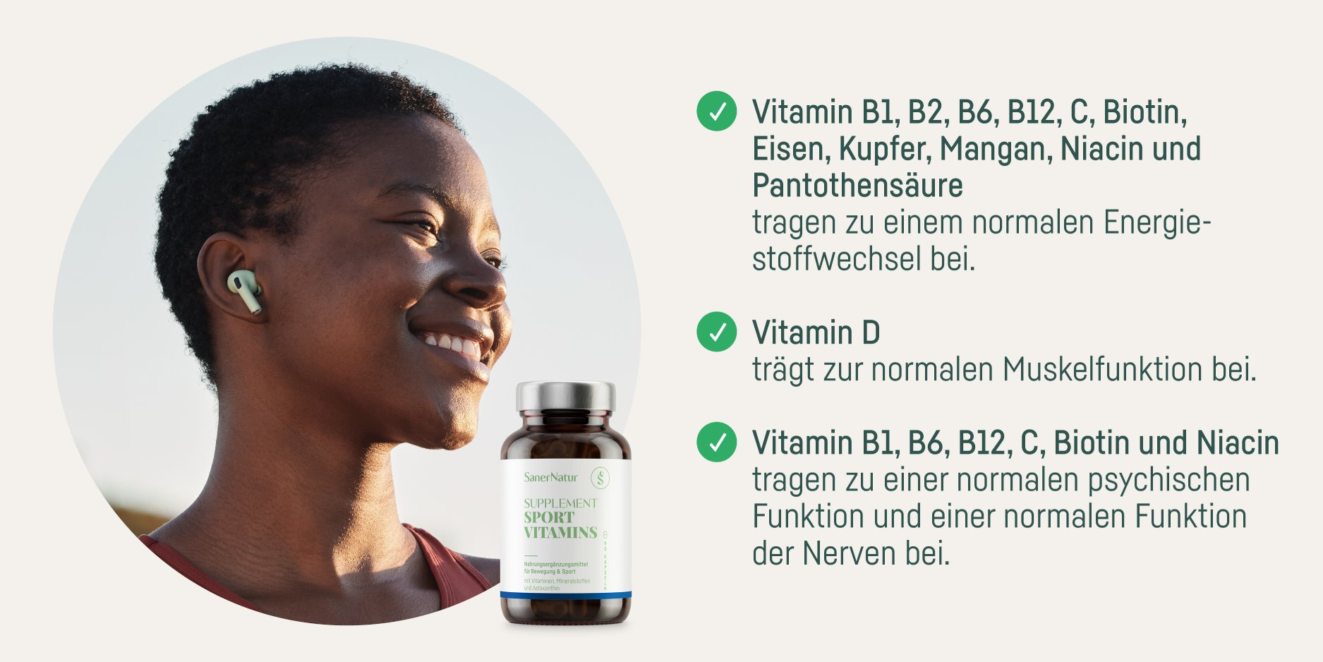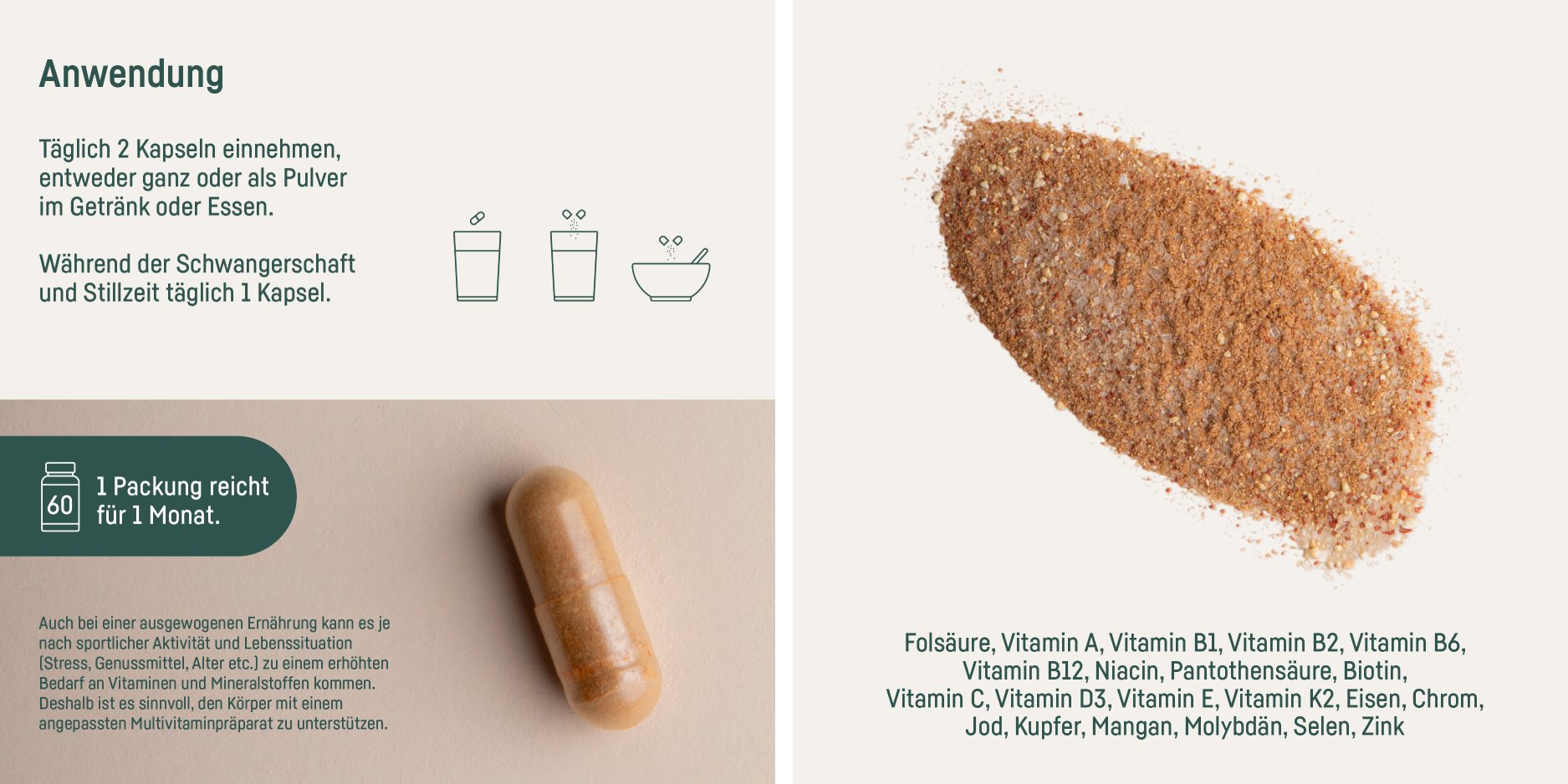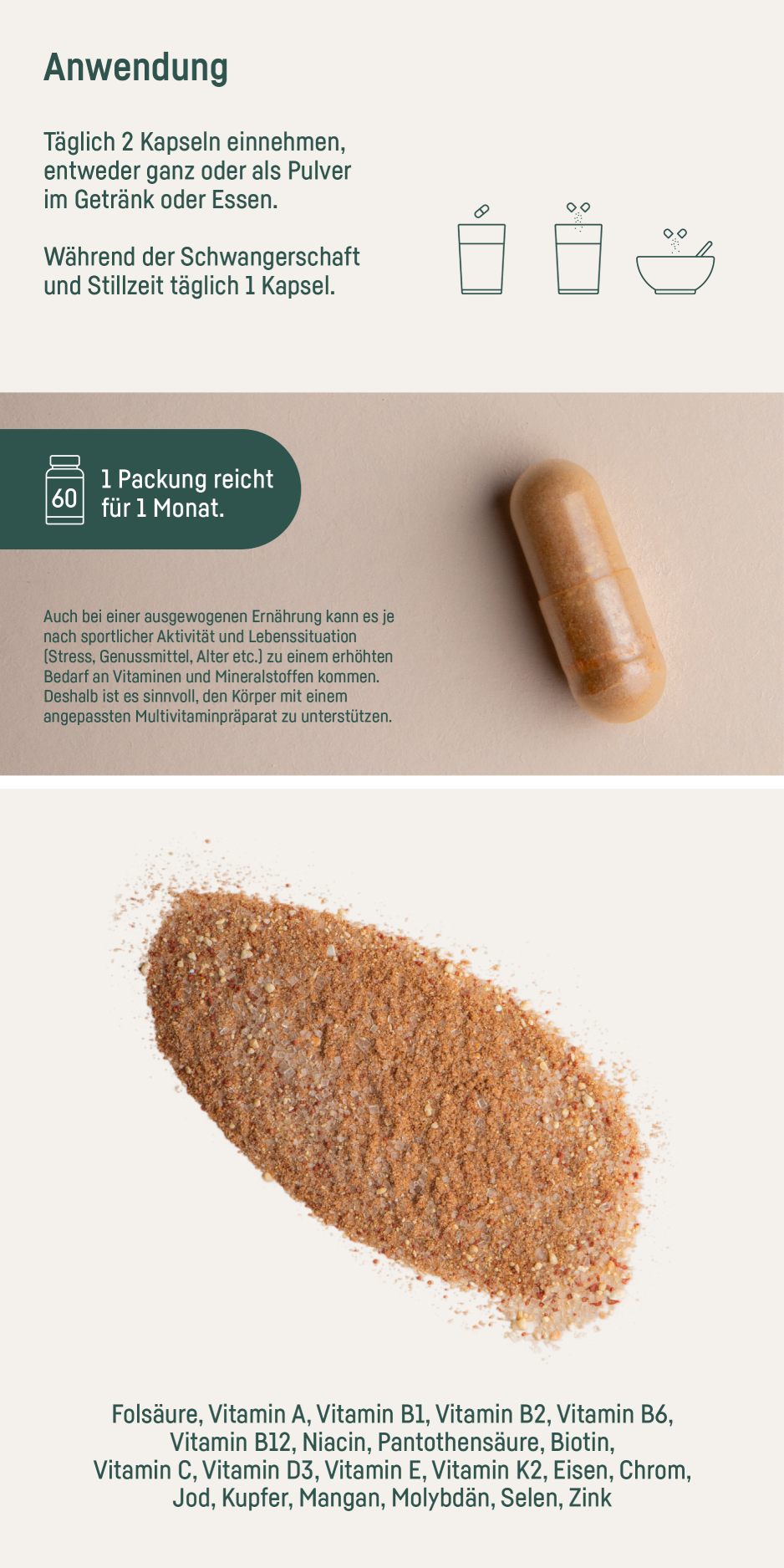Vitamin C (L-Ascorbinsäure), Vitamin E (D-α-Tocopherylsäuresuccinat), Nicotinamid, Calcium-D-Pantothenat, Eisenfumarat, Zinkcitrat , Vitamin B6 (Pyridoxal-5-Phosphat), Astaxanthin natürlich (0.35%), Vitamin B1 (Thia minhydrochlorid), Vitamin B2 (Natrium-Riboflavin-5´-Phos phat), Speisestärke, Kupfercitrat, Maisstärke, Beta-Carotin, Folsäure ((6S)-5-Methyltetrahydrofolsäure Glucosaminsalz)**, Mangancitrat, Biotin, Kaliumjodid, Maltodextrin, Füllstoff Calciumcarbonat, Selen-angereicherte Hefe, Chrompicolinat, Antioxidations mittel Alpha-Tocopherol und Natriumcitrat, Vitamin B12 (Methylcobalamin), Natriummolybdat, Vitamin D3 (Cholecalciferol), Vitamin K2 (Menachinon-7) **Quatrefolic®