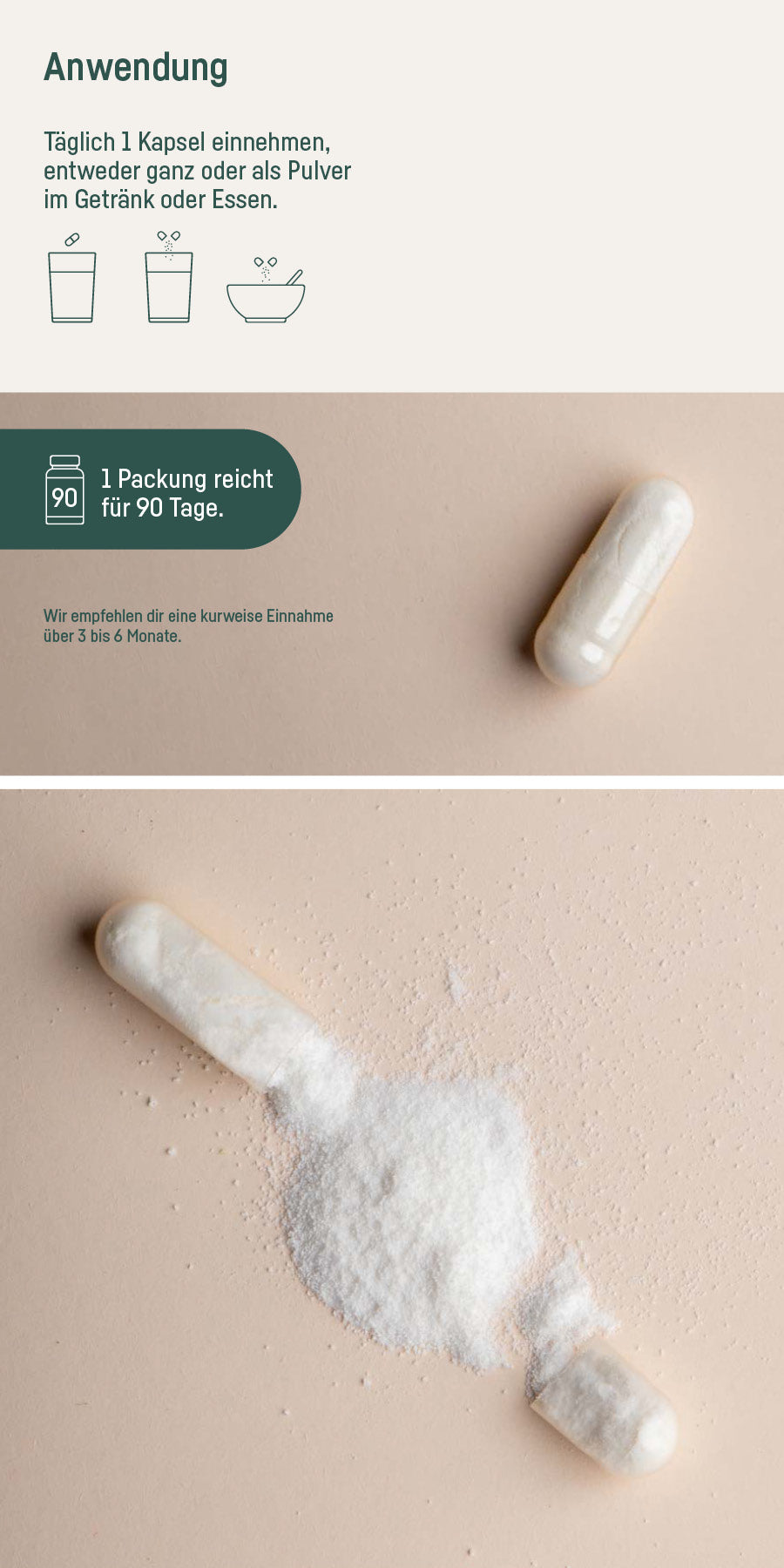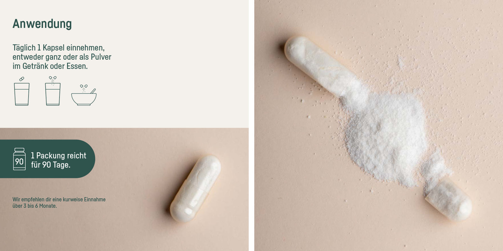 Täglich 1 Kapsel mit Wasser einnehmen, entweder ganz schlucken oder geöffnet als Pulver im Getränk oder Essen beigeben.