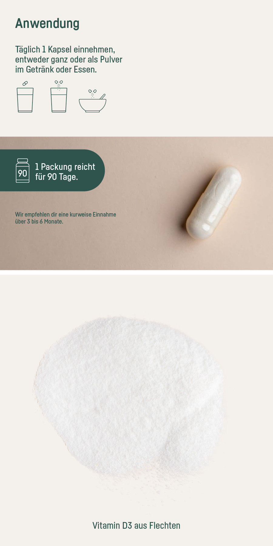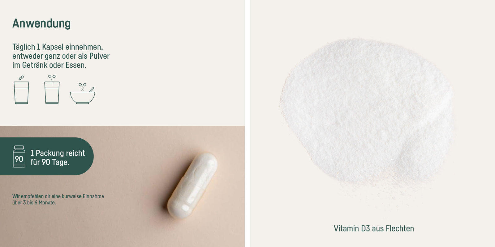 Wir empfehlen dir die Einnahme als Kur über 3 bis 6 Monate, insbesondere über die dunklen Wintermonate.
